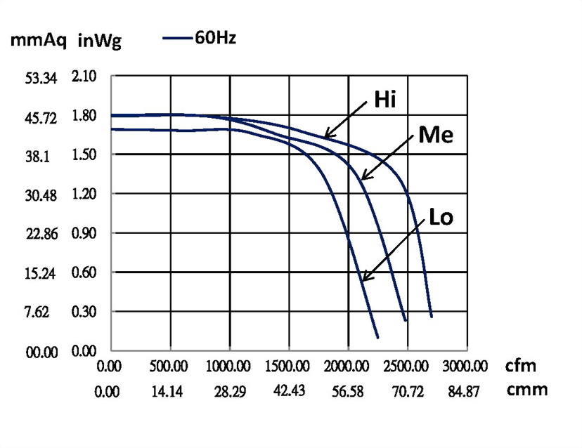 | V | HZ | Φ | A | P | HP | mm/Aq | Inch WG | pa | cmm | cfm | cmh | |||